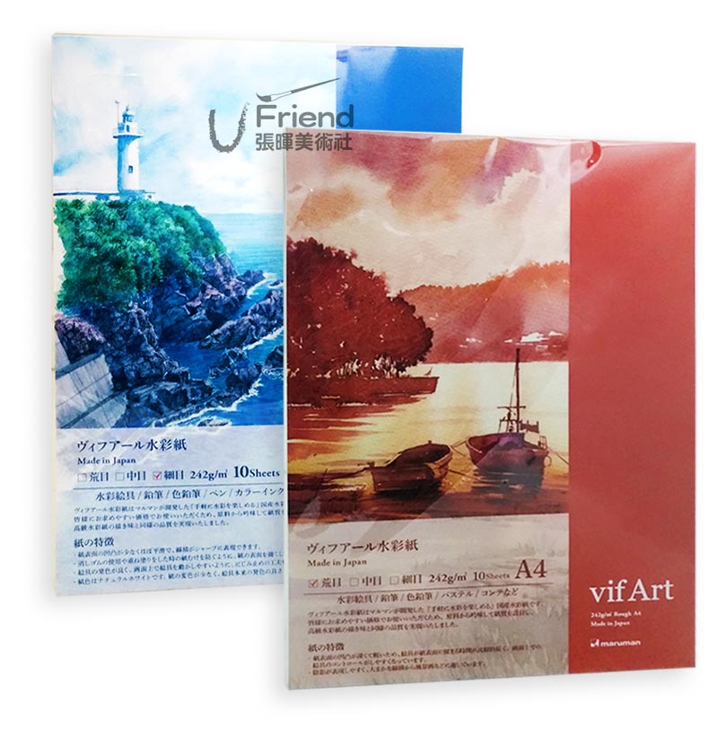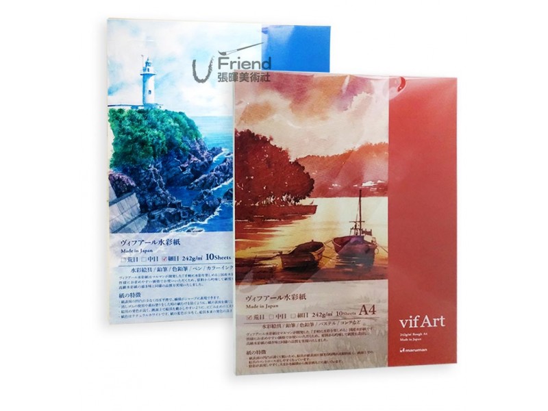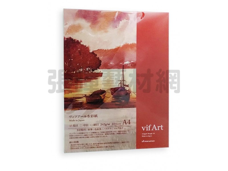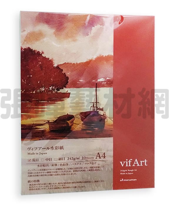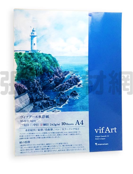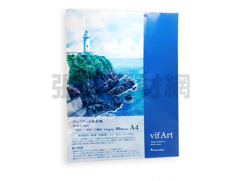 日本Maruman VifArt A4水彩紙為日本製造的高質量水彩紙。加強表面處理,可防止過多使用橡皮擦所造成的紙張損傷。特殊的防滲漏技術使顏料易於在紙張上移動。紙張顏色為自然白色,幾乎沒有變色,並且可以抽出原始顏色。